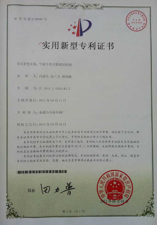 平板車(chē)牽引架緩沖機(jī)構(gòu)專(zhuān)利證書(shū)